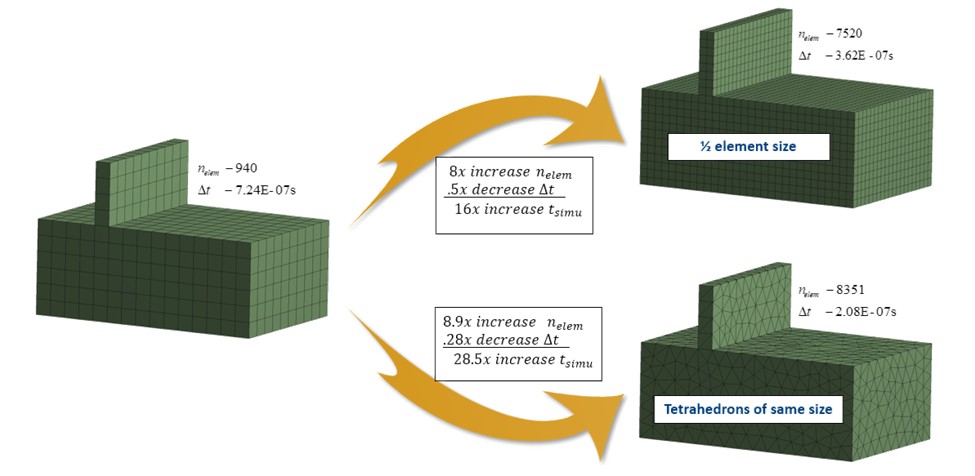 Element size directly affects the critical time stepdue to the CFL (he Courant-Friedrichs-Lewy) condition; the smallest element determines the stable time step in explicit analysis.